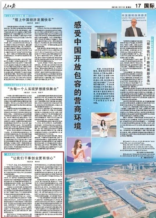 1月11日,《人民日報》第17版刊登《感受中國開(kāi)放包容的營(yíng)商環(huán)境》的報道。得益于中國(廣西)自由貿易試驗區的快速發(fā)展,外國投資者切身感受著(zhù)開(kāi)放包容的營(yíng)商環(huán)境和蓬勃發(fā)展的機遇,加速在當地的增資進(jìn)資。其中采訪(fǎng)了廣西新中產(chǎn)業(yè)投資有限公司董事長(cháng)趙海燕,相關(guān)報道摘錄如下: